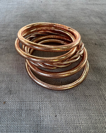 Tubo de silicona flexible de 5 mm de grosor, relleno con auténticas láminas de pan de oro. Cada pulsera ha sido bendecida para convertirse en algo más que un accesorio: