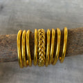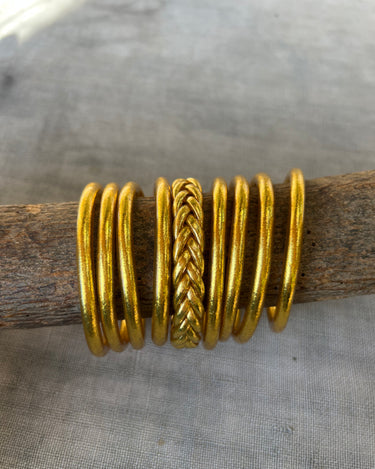 Tubo de silicona flexible de 5 mm de grosor, relleno con auténticas láminas de pan de oro. Cada pulsera ha sido bendecida para convertirse en algo más que un accesorio: