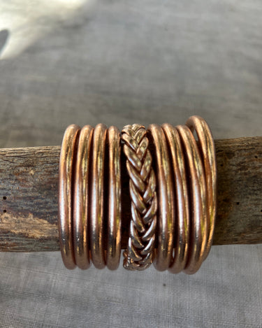 Tubo de silicona flexible de 5 mm de grosor, relleno con auténticas láminas de pan de oro. Cada pulsera ha sido bendecida para convertirse en algo más que un accesorio: