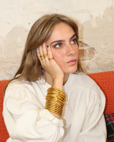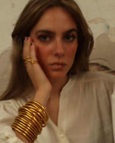 Tubo de silicona flexible de 5 mm de grosor, relleno con auténticas láminas de pan de oro. Cada pulsera ha sido bendecida para convertirse en algo más que un accesorio: