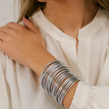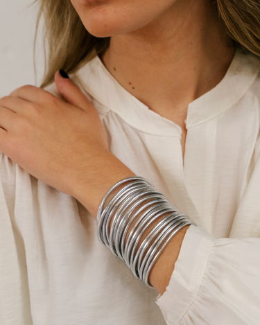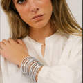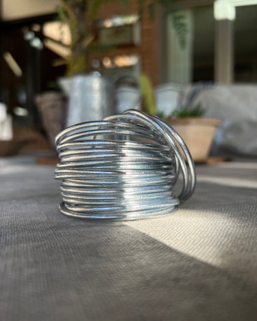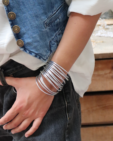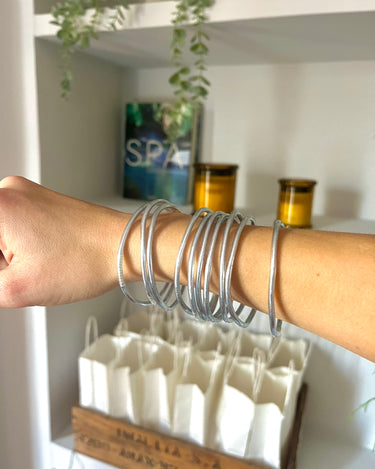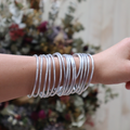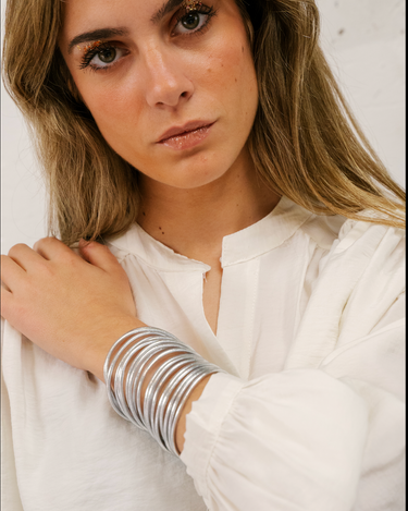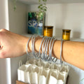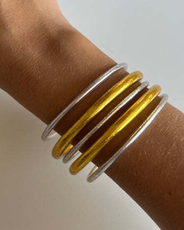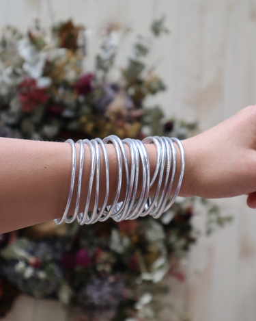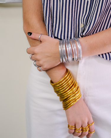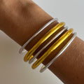 Tubo de silicona flexible de 2 mm de grosor, relleno con auténticas láminas de pan de oro. Cada pulsera ha sido bendecida para convertirse en algo más que un accesorio: